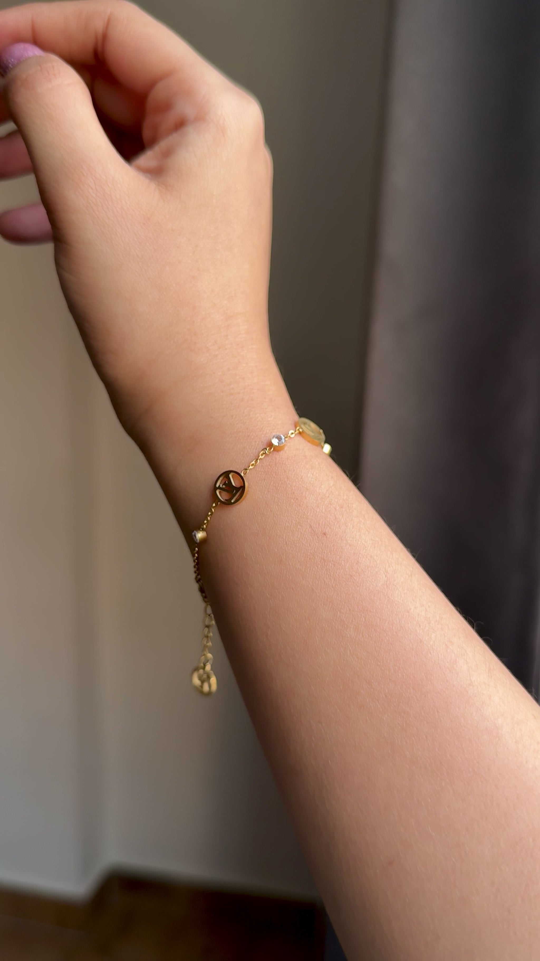 Delicate, chic, and irresistibly luxurious—this dainty bracelet is crafted with 18ct gold plating and adorned with signature LV-style motifs. Each motif is interlinked with sparkling American diamonds, adding just the right touch of brilliance and sophistication.