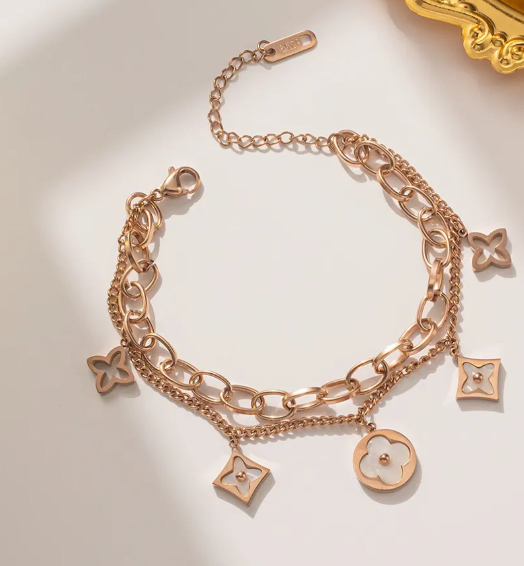 Elevate your everyday style with this Rose Gold Double-Layer Bracelet, inspired by the iconic LV Floral Charms. Designed with interlinked chains and delicate flower motifs, it perfectly balances elegance and modern luxury. Crafted with premium gold plating, this bracelet is anti-tarnish, ensuring long-lasting shine and wearability.
